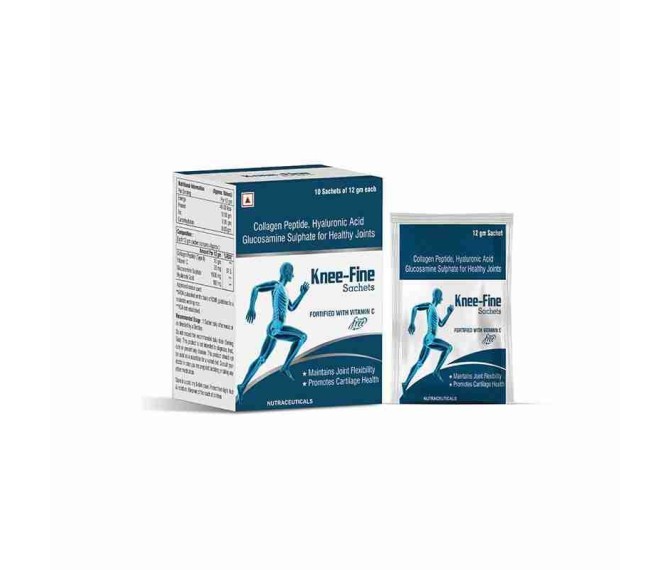 Composition : Collagen Peptide , Hyaluronic Acid Glucosamine Sulphate for Healthy Joints Packing : 10*12 G. Type : Sachet Detail:-Knee-Fine Sachet is a convenient joint health supplement by AstoCare Pharma to support knee mobility and strengthen joints.