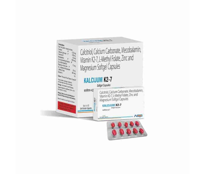 Composition : Calcitriol 0.25 Mcg + Calcium Carbonate 1250 Mg + Vitamin K27 45 Mcg + Methylcobalamin 1500 Mcg + Zinc 7.5 Mg +magnesium 50 Mg + L- Methylfolate – 800 Mcg – Soft Gelatin Capsule In Drug Packing : 10*1*10 Type : Blister Detail:-Kalcijum‑K27 is a calcium and potassium supplement by AstoCare Pharma to support bone and muscle health.