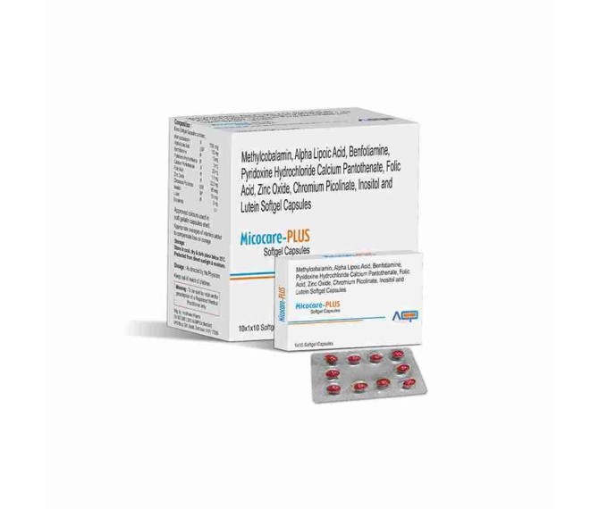 Composition : Methylcobalamin 1500 Mcg + Ala 100 Mg + Benfotiamine 15 Mg + Pyridoxine Hydrochloride 3 Mg + Calcium Pantothenate 25 Mg + Folic Acid 1.5 Mg + Zinc Oxide 22.5 Mg + Chromium Picolinate 65 Mcg + Inositol 10 Mcg + Lutein 5 Mg Soft Gelatin Capsule In Drug Packing : 10*1*10 Type : Blister Detail:-Micocare Plus is an antifungal and probiotic supplement by AstoCare Pharma to support gut health and immunity.