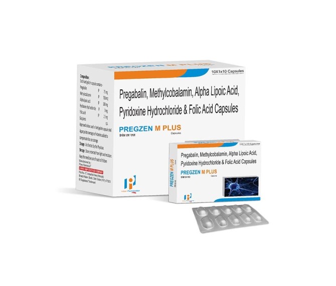 Composition : Pregabalin 75 Mg + Mecobalamin 750 Mcg + Alpha Lipoic Acid 100 Mg + Folic Acid 1.5 Mg + Pyridoxine 3 Mg Packing : 10*1*10 Type : Alu Alu Detail:-PREGZEN M-PLUS with Pregabalin SR and Methylcobalamin for neuropathic pain and nerve support from Indizen Pharma.