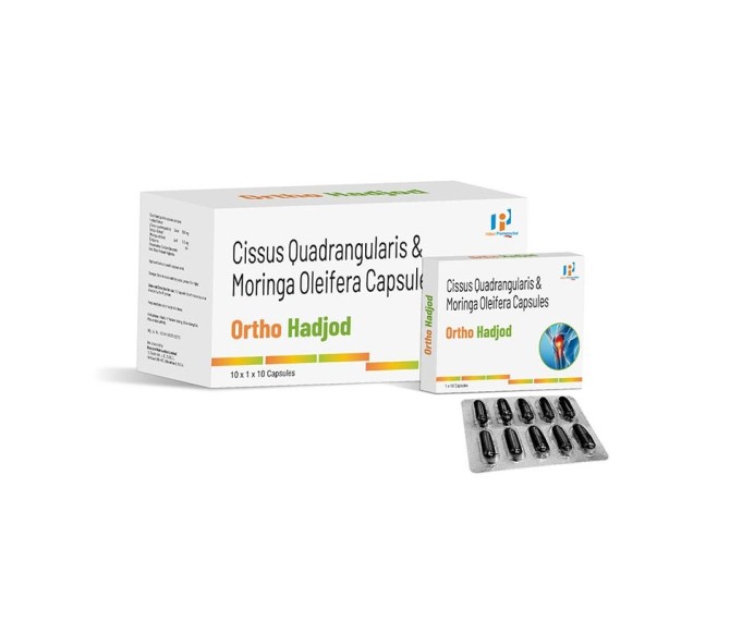 Composition : Hadjod Extract 500 Mg (Cissus Quadrangularis ) + Sahijna Extract 100 Mg ( Moringa Oleifera ) Packing : 10*1*10 Type : Blister Detail:-Ortho Hadjod contains Cissus quadrangularis (Hadjod), a traditional herb used to support bone strength, fracture healing, and joint health.