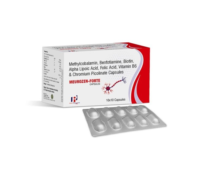 Composition : Methylcobalamin 1500mcg + Folic Acid 1.5mg+alpha Lipoic Acid 100mg+pyridoxine 3mg + Benfotiamine 50 Mg + Biotin 5 Mg + Chromium 200 Mcg Packing : 10*10 Type : Alu Alu Detail:-Meurozen Forte contains Methylcobalamin, Alpha-Lipoic Acid, Pyridoxine, Folic Acid, Benfotiamine & Biotin to support nerve health, metabolism, and antioxidant activity
