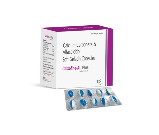Composition : Alfacalcidol 0.25 Mcg+ Calcium Carbonate 500 Mg Packing : 10*10 Type : Blister Detail:-Calxofine AL Plus combines Alfacalcidol 0.25 mcg and Calcium to support bone health and calcium regulation.