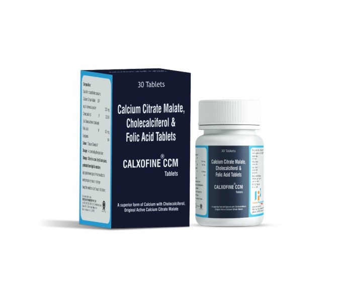 Composition : Calcium Citrate 250 Mg + Vitamin D3 100 Iu + Folic Acid 50 Mcg Packing : 1*30 Type : Bottle Pack Detail:-Calxofine CCM with Calcium Citrate, Vitamin D3, and Folic Acid supports bone health and calcium absorption.