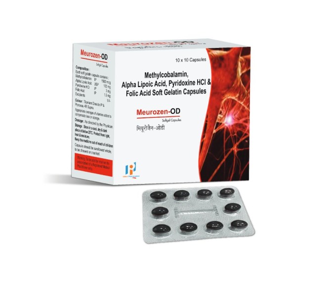 Composition : Methylcobalamin 1500mcg + Folic Acid 1.5mg + Alpha Lipoic Acid 100mg + Pyridoxine 3mg Soft Gel Cap In Drug Packing : 10*10 Type : Blister Detail:-Meurozen OD injection contains Methylcobalamin 1,500 mcg to support vitamin B12 replenishment and nerve health.