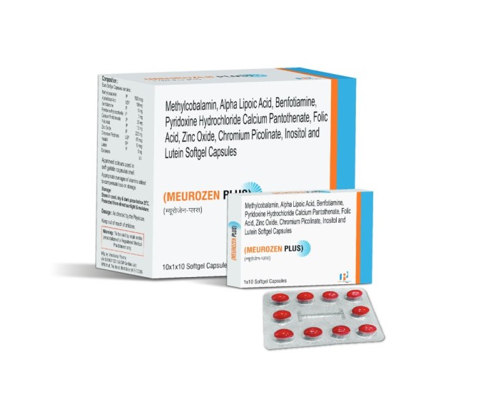 Composition : Methylcobalamin 1500 Mcg + Ala 100 Mg + Benfotiamine 15 Mg + Pyridoxine Hydrochloride 3 Mg + Calcium Pantothenate 25 Mg + Folic Acid 1.5 Mg + Zinc Oxide 22.5 Mg + Chromium Picolinate 65 Mcg + Inositol 10 Mcg + Lutein 5 Mg Soft Gelatin Capsule In Drug Packing : 10*1*10 Type : Blister Detail:-Meurozen Plus softgel combines Methylcobalamin 1500 mcg, Alpha-Lipoic Acid 100 mg, Benfotiamine, Pyridoxine, Folic Acid, Zinc, Chromium, Inositol & Lutein to support nerve health and metabolic function.