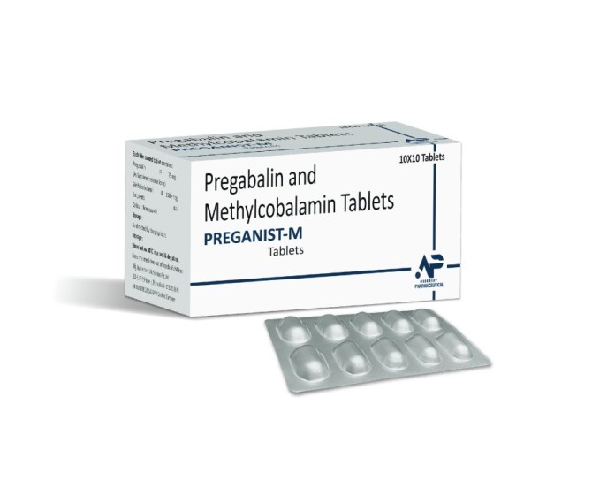 Composition : Pregabalin 75 Mg + Methylcobalamin 1500 Mcg Packing : 10*10 Type : Alu Alu Detail:-Preganist M combines Pregabalin 75 mg with Methylcobalamin 1500 mcg to support neuropathic pain relief and nerve regeneration.