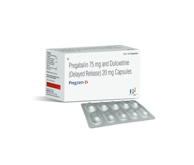 Composition : Pregabalin 75 Mg + Duloxetine 20 Mg Packing : 10*10 Type : Alu Alu Detail:-Pregzen-D — Extended-release Pregabalin with Methylcobalamin & Vitamin B-Complex, designed for effective neuropathic pain and nerve health support by Indizen Pharmaceutical.