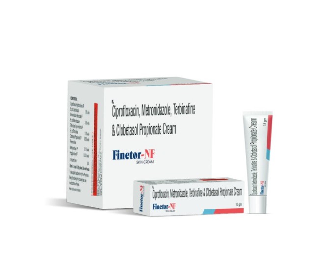 Composition : Clobetasol(0.05 %w/w) + Terbinafine(1.0 %w/w) + Ciprofloxacin(1.0 %w/w) + Metronidazole(2.0 %w/w) Packing : 25*1*15 Type : 15g. Detail:-Clobetasol 0.05% + Terbinafine 1% + Ciprofloxacin 1% + Metronidazole 2% cream for complex dermatological infections.