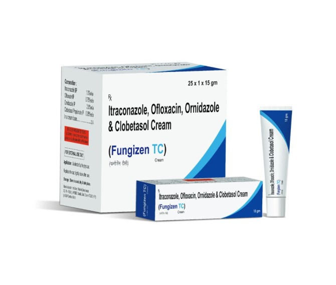 Composition : Ofloxacin 0.75% + Ornidazole 2.0% + Itraconazole 1% +clobetasol Propionate 0.05% Non Greasy Gel. Packing : 42*1 Type : Plastic Box Detail:-Four-in-one formula with Terbinafine 1% + Ofloxacin 0.75% + Ornidazole 2% + Clobetasol 0.05% for mixed fungal-bacterial skin infections.