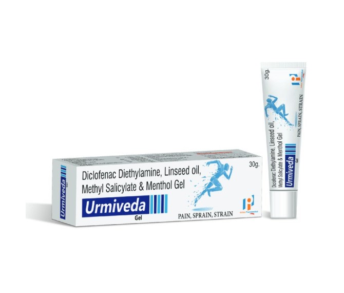 Composition : Linseed Oil 3% + Diclofenac 1.16% + Methyl Salicylate 10.0% + Menthol 0.5% + Benzyl 1.0% Gel Packing : 20*1 Type : Mono Pack 30gm. Detail:-URMIVEDA Gel by Indizen Pharma – an ayurvedic-inspired topical gel with menthol, camphor & essential oils for natural relief of muscle and joint discomfort.