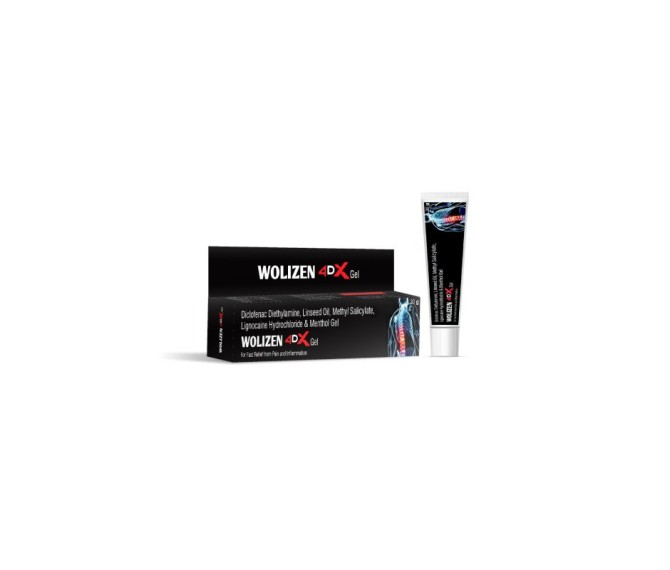 Composition : inseed Oil 3% + Diclofenac 3.48 %+ Methy Salicylate 10.0% + Menthol 5.0% + Benzyl 1.0% + Lidocaine 2.5% Packing : 20*30 Type : Mono Pack Detail:-Linseed Oil 3%, Diclofenac + Methyl Salicylate 10% + Menthol 5% + Lidocaine 2.5% — WOLIZEN-4DX Gel by Indizen Pharma for enhanced muscle & joint pain relief.