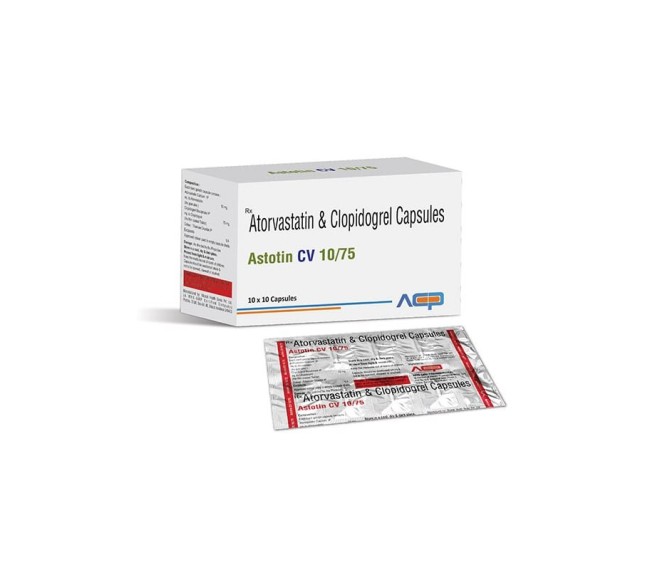 Composition : Atorvastatin 10 Mg + Clopidogrel 75 Mg Packing : 10*10 Type : Strip Packing Detail:-Astotin CV 10/75 mg by Asto Care Pharma: combines Atorvastatin 10 mg + Clopidogrel 75 mg for cholesterol control and blood clot prevention.