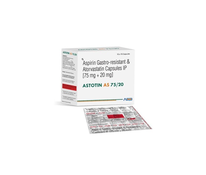 Composition : Atorvastatin 20 Mg + Aspirin 75 Mg Packing : 10*15 Type : Strip Packing Detail:-Astotin AS 75/20 by Asto Care Pharma: combines Atorvastatin 20 mg + Aspirin 75 mg for managing cholesterol and cardiovascular risk.