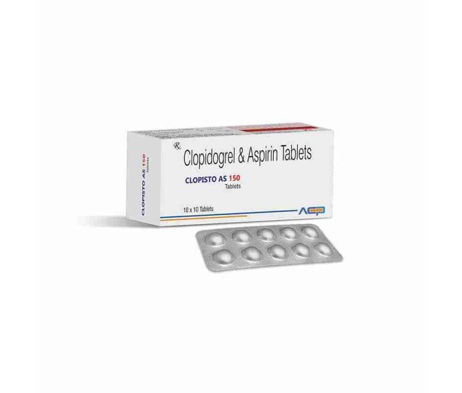 Composition : Clopidogrel 75 Mg + Aspirin 150 Mg Packing : 10*15 Type :  Strip Packing Detail:-Clopisto AS 150 by Asto Care Pharma is a dual antiplatelet therapy (Aspirin + Clopidogrel) used to prevent heart attacks, strokes, and other atherothrombotic events.