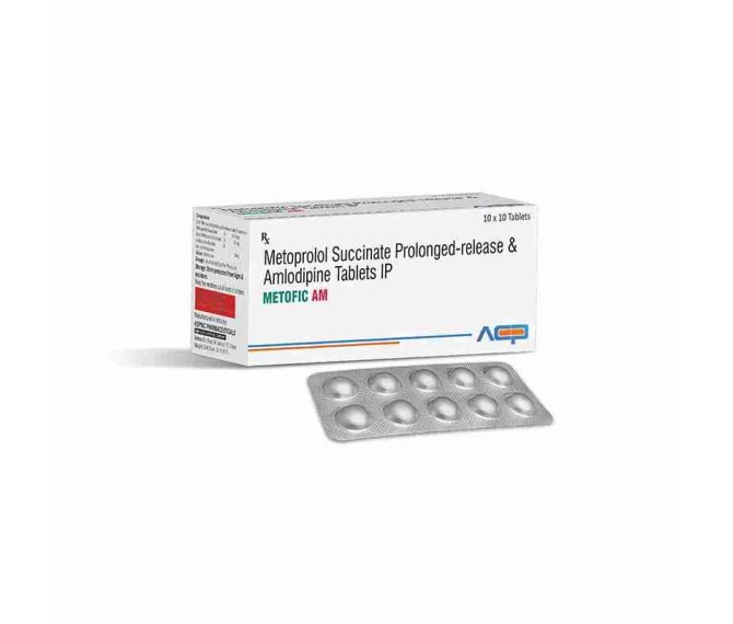 Composition : Metoprolol Succinate 50 Mg + Amlodipine 5 Mg Packing : 10*10 Type : Alu Alu Detail:-Metofic AM by Asto Care Pharma is a fixed-dose combination of Metoprolol Succinate and Amlodipine to manage hypertension and angina.
