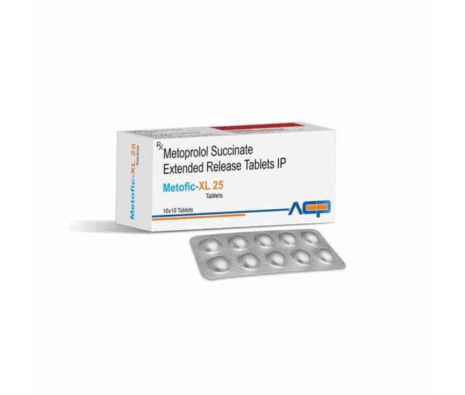 Composition : Metoprolol Succinate Prolonged Release 25 Mg Packing : 10*10 Type : Alu Alu Detail:-Metofic XL 25 by Asto Care Pharma is an extended-release metoprolol succinate tablet used to treat high blood pressure, angina, and heart failure