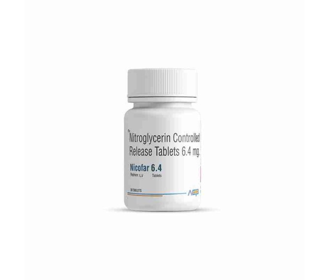 Composition : Nitroglycerine 6.4 mg Packing : 1*30 Type : Bottle Pack Detail:-Nicofar 6.4 by Asto Care Pharma contains Nicorandil 6.4 mg, a potassium channel opener and vasodilator used for treating chronic angina.