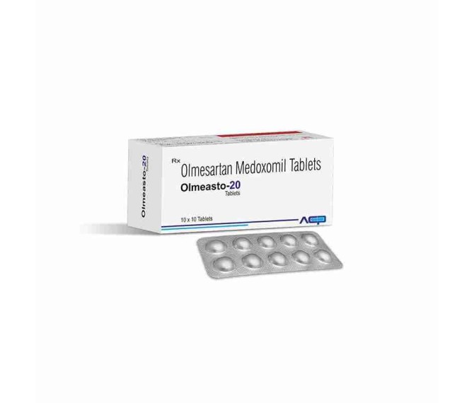 Composition : Olmesartan Medoxomil 20 Mg Packing : 10*10 Type : Alu Alu Detail:-Olmeasto 20 by Asto Care Pharma contains Olmesartan 20 mg, an angiotensin II receptor blocker used to treat high blood pressure