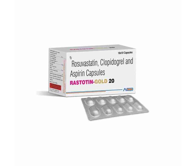 Composition : Aspirin 75 + Rosuvastatin 20 Mg + Clopidogrel 75 Mg Packing : 10*10 Type : Alu Alu Detail:-Rastotin Gold 20 combines rosuvastatin 20 mg, clopidogrel 75 mg, and aspirin 75 mg for lipid control and cardiovascular protection.