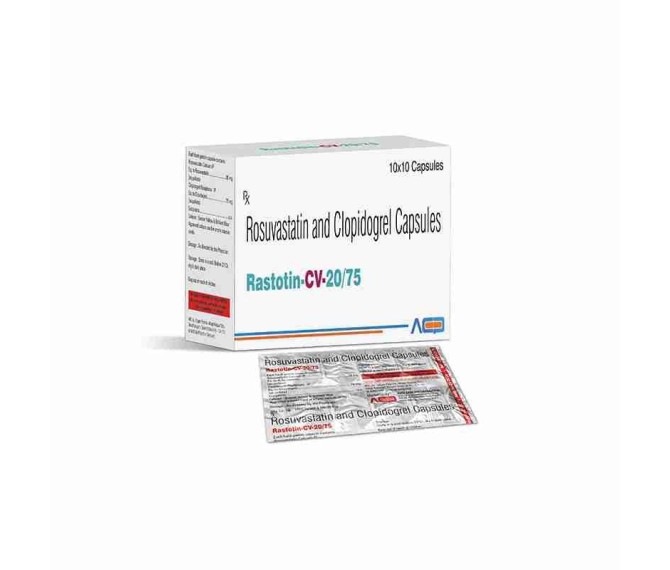 Composition : Rosuvastatin 20 Mg + Clopidogrel 75 Mg Packing : 10*10 Type : Strip Packing Detail:-Rastotin CV 75/20 combines rosuvastatin 20 mg and aspirin 75 mg for lipid control and cardiovascular protection.