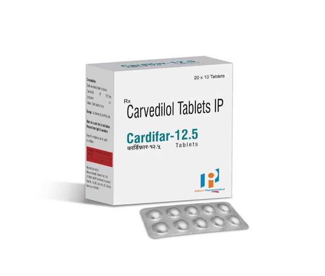 Composition : Carvedilol 12.5 Packing : 20*10 Type : Alu Alu Detail:-Carvedilol 12.5 tablets is a vasodilatory non-selective beta-blocker, which reduces the peripheral vascular resistance by selective alpha 1- receptor.