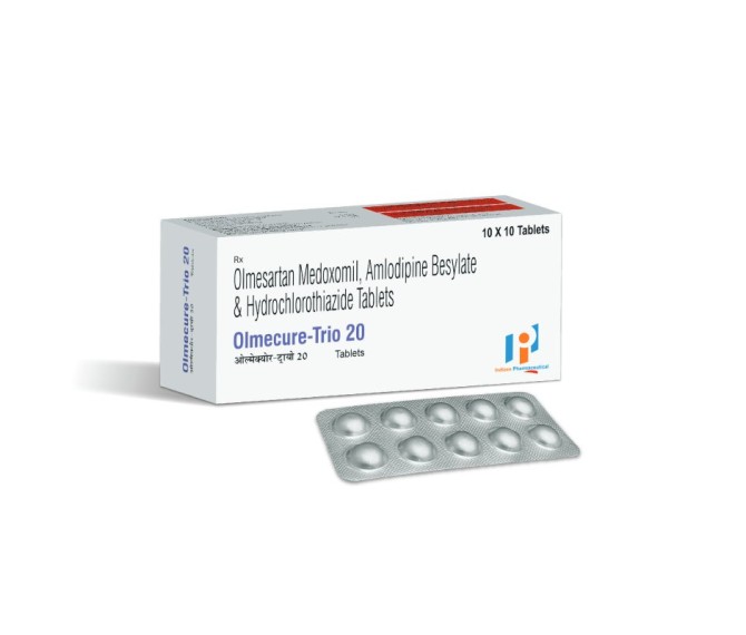 Composition : Olmesartan Medoxomil 20 Mg + Amlodipine 5 Mg + Hydrochlorothazide 12.5 Mg Packing : 10*10 Type : Alu Alu Detail:-Olmesartan Medoxomil 20 Mg + Amlodipine 5 Mg + Hydrochlorothazide 12.5 Mg is a combination medication primarily used to treat high blood pressure.