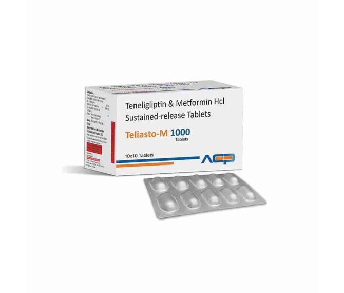 Composition : Teneligliptin 20 Mg + Metformin 1000 Mg (Dcgi Approved) Packing : 10*10 Type :  Alu Alu Detail:-TELIASTO M 1000 by Asto Care Pharmaceutical helps control blood sugar levels in Type 2 Diabetes, ensuring better glycemic management and overall health.