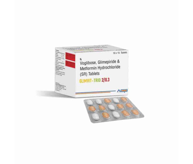 Composition : Glimepiride 2 Mg + Metformin 500 Mg Sr + Voglibose 0.3 Mg Packing : 10*15 Type : Blister Detail:-GLIMVIT TRIO 2/0.3 by Asto Care Pharmaceutical helps control blood sugar in Type 2 Diabetes and improves insulin sensitivity for effective glucose management.