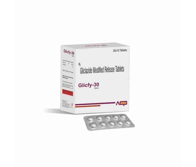 Composition : Gliclazide 30 Mg Sr Packing : 20*10 Type : Blister Detail:-GLICFY 30 (Gliclazide 30mg) helps manage type 2 diabetes by controlling blood sugar levels and supporting better glycemic control in adults.