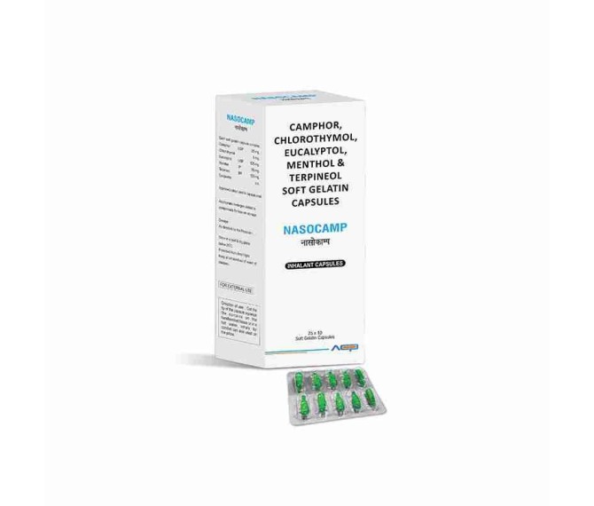 Composition : Camphor 25 Mg + Chlorothymol 5 Mg + Eucalyptol 125 Mg + Menthol 55 Mg + Terpineol 120 Mg Packing : 25*10 Type : Blister Detail:-Nasocamp Tablet with Camphor, Menthol & Eucalyptol eases nasal congestion and supports breathing.