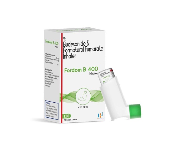 Composition : Budesonide Ip 400 Mcg + Formoterol Fumarate 6 Mcg Inhaler Packing : 120 M.D Type : Mono Pack Detail:-Fordom B‑400 Inhaler: Budesonide 400 mcg + Formoterol 12 mcg MDI for asthma & COPD relief.
