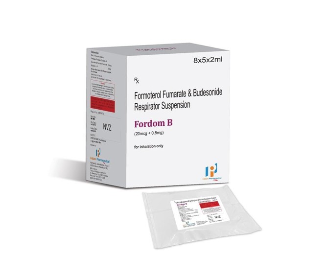 Composition : Formoterol 20 Mcg + Budesonide 0.5 Mg Packing : 2 ml Type : 8*5*2 ml Detail:-Fordom B Respules: Formoterol 20 mcg + Budesonide 0.5 mg nebulizer solution for asthma & COPD relief.