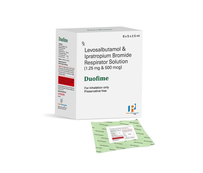 Composition : Levosalbutamol 1.25 Mg + Ipratropium 500 Mcg Packing : 2.5 ml Type : 8*5*2.5 ml Detail:-Duofime Respules contain Levosalbutamol 1.25 mg and Ipratropium 500 mcg, a powerful inhalation solution for relieving bronchospasm in asthma and COPD. Available in 2.5 ml respules at Indizen Pharma.