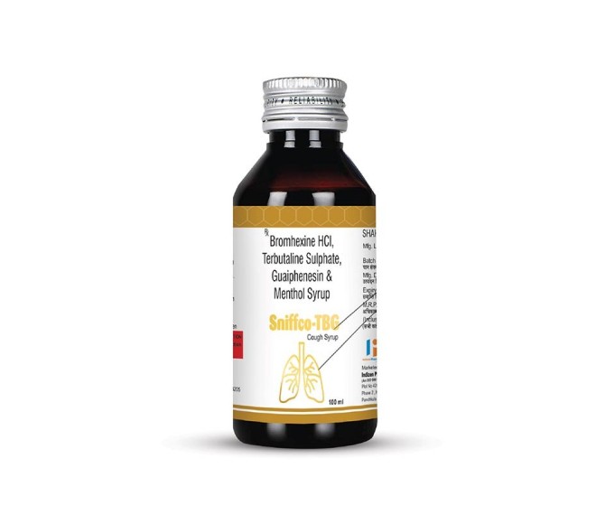 Composition : Terbutaline 1.25 Mg + Bromhexine 2 Mg + Guaiphenesin 50 Mg + Menthol 0.5 Mg Packing : 100 Ml Type : Without Mono Detail:-Sniffco TBG provides quick relief from cold, cough, and allergy symptoms. Reliable formula by Indizen Pharma.