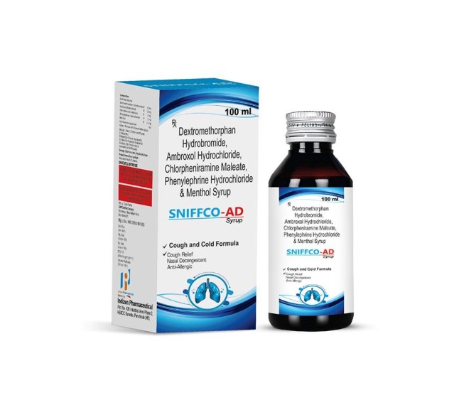 Composition : Dextromethorphan 10 Mg + Cpm 2 Mg + Ambroxol 15 Mg + Menthol 1.5 Mg + Phenylephrine 5 Mg Packing : 100 ml Type : Mono Pack Detail:-Sniffco‑AD contains Dextromethorphan, CPM, Ambroxol, Menthol & Phenylephrine in a 100 ml syrup for cough and cold symptom relief