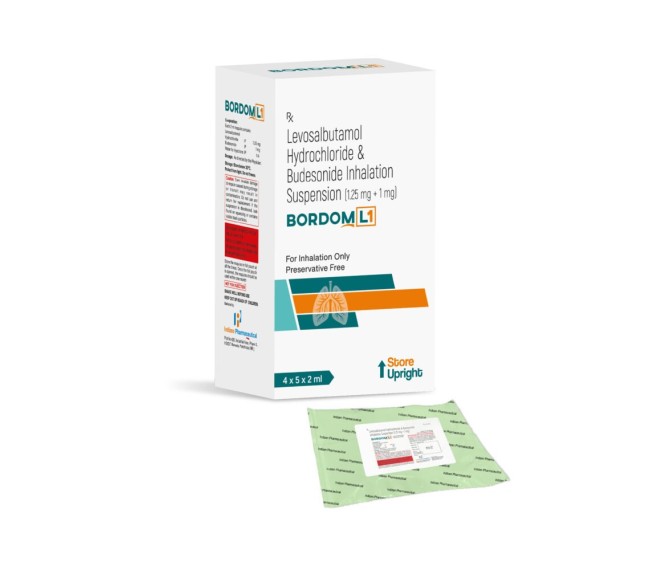 Product Name:-BORDOM L1 RESPULES Composition:- LEVOSALBUTAMOL 1.25 MG + BUDESONIDE IP 1 MG Packing:-2 ML Type:-4*5*2 Detail:-BORDOM L1 Respules help relieve bronchospasm in asthma & COPD. Effective combination for quick bronchodilation and easier breathing.