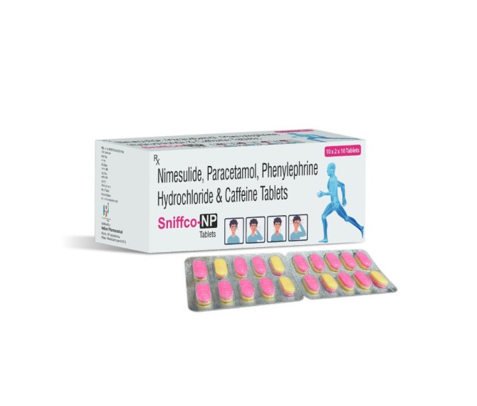 Composition : Nimusulide 100 Mg + Pcm 325 Mg + Caffine 25 Mg + Phenylephrine 10 Mg Packing : 20*10 Type : Blister Detail:-Sniffco‑NP tablets: Nimesulide 100 mg + Paracetamol 325 mg + Phenylephrine 10 mg + Caffeine 25 mg for effective relief from cold, pain & nasal congestion.