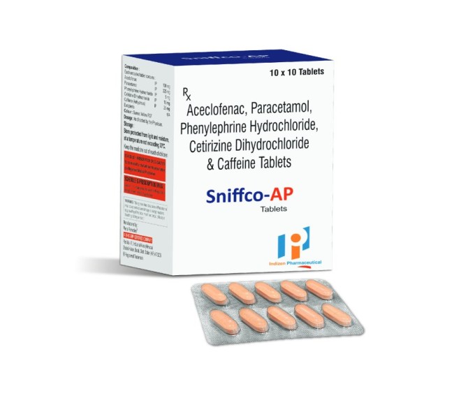 Composition : Aceclofenac 100 Mg + Paracetamol 325 Mg + Phenylephrine 5 Mg + Cetrizine 10 Mg + Ceffeine 25 Mg Packing : 10*10 Type : BLister Detail:-Sniffco‑AP tablets contain Aceclofenac 100 mg, Paracetamol 325 mg, Phenylephrine 5 mg, Cetirizine 10 mg & Caffeine 25 mg for cough, cold & allergy relief.