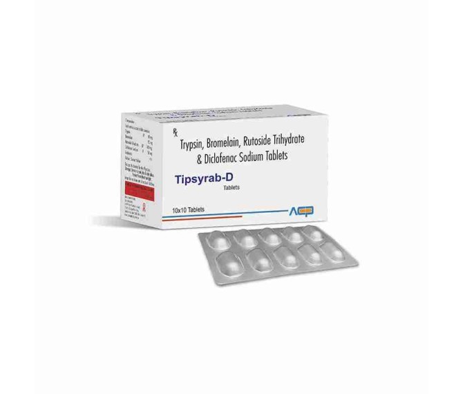 Composition : Trypsin 48 Mg + Bromelain 90 Mg + Diclofenac 50 Mg + Rutoside 100 Mg . Packing : 10*10 Type : Alu Alu Detail:-TIPSYRAB D (Diclofenac + Paracetamol + Enzyme combination) by Asto Care — for relief from pain, swelling and inflammation.