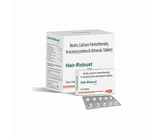 Composition : Biotin 10 Mg + Calcium Pantothenate 100 Mg + Acetylcysteine 50 Mg + Zinc 22.5 Mg In Drug Packing : 10*1*10 Type :  Alu Alu Detail:-Asto Hair Robust – advanced hair care supplement to support hair growth, strengthen roots, reduce hair fall and nourish scalp for healthier, stronger hair.