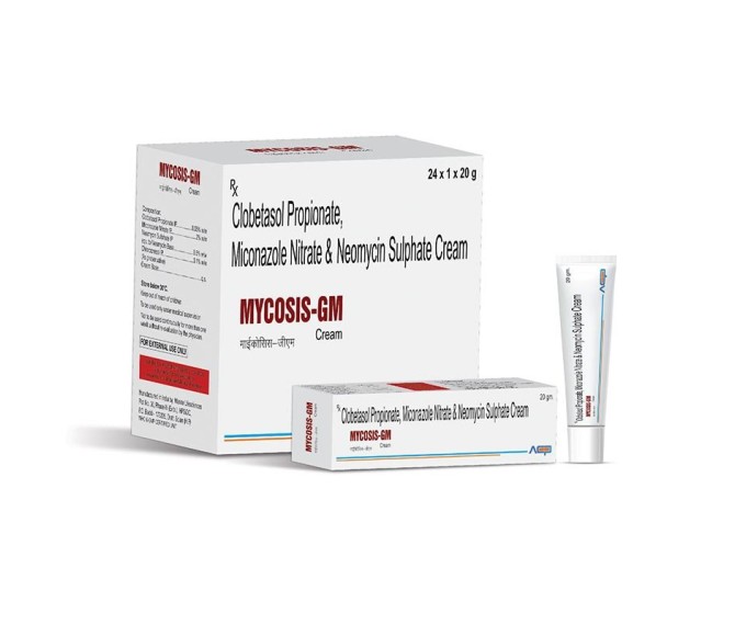 Composition : Clobetasol Propionate 0.05 % + Miconazole Nitrate 2% + Neomycin Base 0.5% + Chlorocresol 0.1%. Packing : 24*1 Type :  Mono Pack 20 gm Detail:-Mycosis GM cream treats fungal and bacterial skin infections, reducing itching and inflammation.