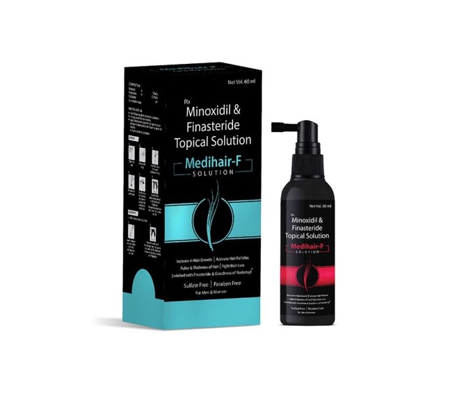 Composition : Minoxidil Solution 5% + Finasteride 0.1% With Trey , Droper & Sprey Packing : 60 ML Type : Mono Pack Detail:-MediHair F by Indizen Pharma – helps control hair fall, strengthens roots, nourishes scalp, and promotes healthy, thick, and resilient hair.