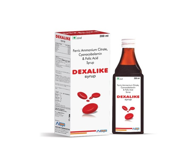 Ferric Ammonium + Cyancobalamin & Folic Acid Syrup Like ( Dexorange ) Detail:-Dexalike syrup with Ferric Ammonium, Cyanocobalamin & Folic Acid supports iron and vitamin deficiency management. Quality pharmaceutical by Asto Care Pharma