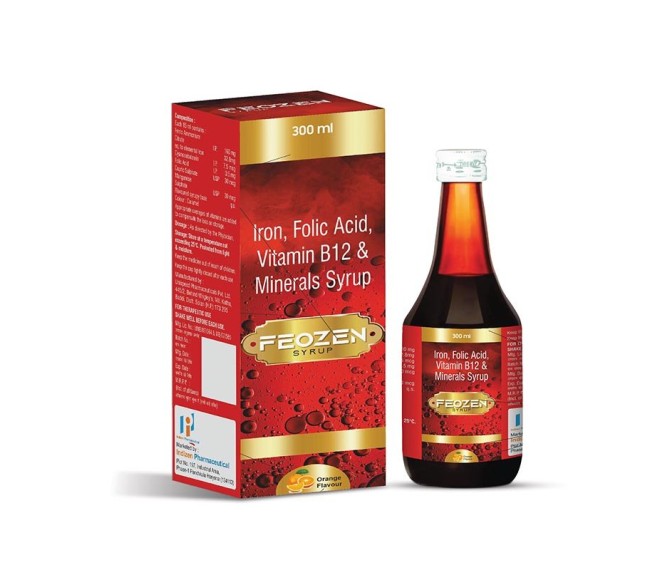 Composition : Ferric Ammonium Citrare 160 Mg + Elemental Iron 32.8 Mg + Cyanocobalamin 7.5 Mg + Dolic Acid 0.5 Mg + Cupric Sulphate 30 Mcg + Manganese Sulphate 30 Mcg Packing : 300 ML Type : Mono Pack Detail:-FEOZEN 300 by Indizen Pharma helps treat and prevent iron deficiency anemia, boosting hemoglobin levels and improving overall vitality.