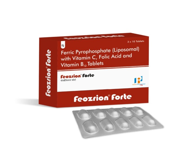 Product Name:-FEOZRION FORTE Composition: ELEMENTAL IRON30 MG + VITAMIN C 50 MG + FOLIC ACID 200 MCG + VITAMIN B12 – 0.75 MCG Packing:-12*10 Type:-ALU ALU Detail:-Feozrion Forte Tablets are a hematinic supplement formulated with iron, folic acid, and essential vitamins to support hemoglobin levels and manage iron deficiency anemia.