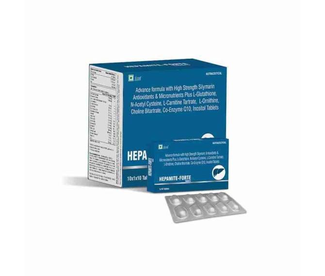 Composition : N-acetyl Cysteine 50 Mg + Silymarine 140 Mg + L-glutathione 15 Mg + Choline Bitartrate 50 Mg + L-ornithine 50 Mg + C–enzyme Q10 2.5 Mg + L-carnitine 50 Mg + Inositol 50 Mg + Vitamin B1 5 Mg + B2 3 Mg + B6 5 Mg + B12 20 Mcg + Vitamin C 75 Mg + Vitamin D3 500 Iu + Calcium Pantothenate 10 Mg + Elemental Zinc 10 Mg + Elemental Iron 3 Mg + Vitamin E Acetate 12.5 Mg Packing : 10*1*10 Type : Alu Alu Detail:-HEPAMITE FORTE by Asto Care supports liver health, detoxification, and better digestion for overall wellness.