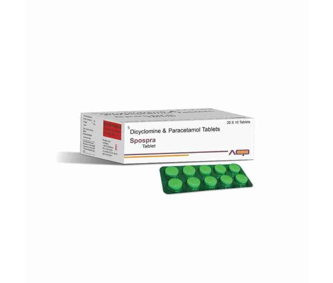 Composition : Dicyclomine 20 Mg + Paracetamol 325 Mg Packing : 20*10 Type : Blister Detail:-SPOSPRA by Asto Care Pharmaceutical soothes acidity and protects the stomach lining for lasting relief from ulcers and heartburn.
