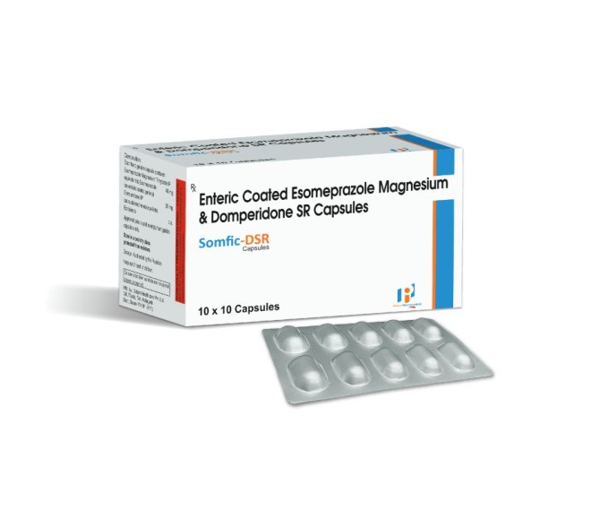 Composition : Esomeprazole 40 Mg + Domperidone 30 Mg Sr Packing : 10*10 Type : Alu Alu Detail:-SOMFIC DSR – Dual-action relief from muscle pain and spasms. Trusted solution by Indizen Pharma.