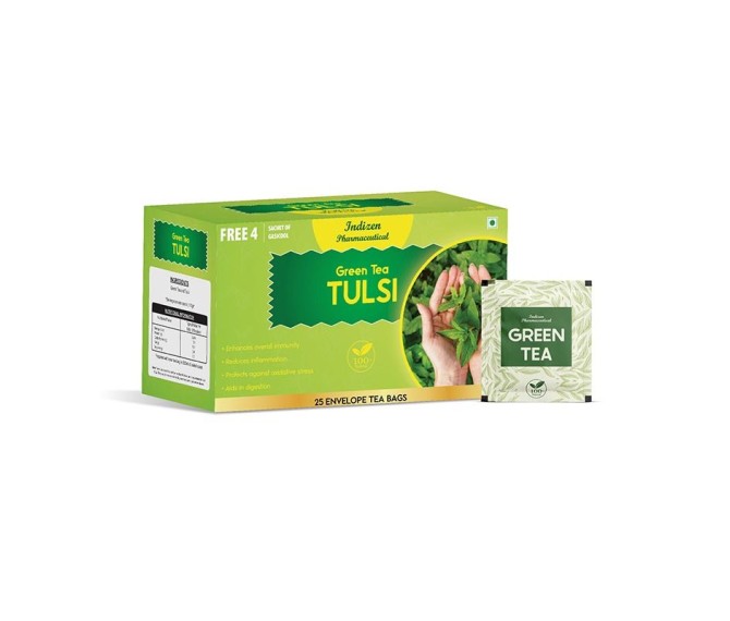 Composition : Green Tea + Tulsi Packing : 25 BAGS Type : 25*1.3G Detail:-Discover the natural goodness of Green Tea Tulsi by Indizen Pharma — a soothing blend of antioxidant‑rich green tea and herbal tulsi, designed to support immunity, aid digestion, reduce stress and promote overall wellness.
